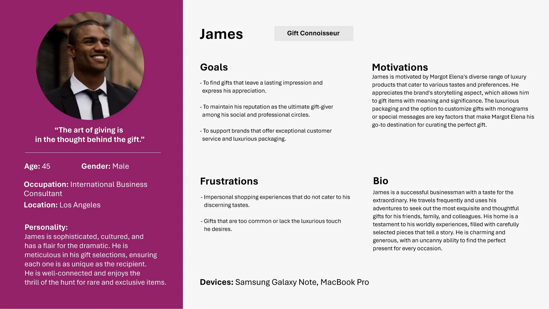 To empathize with the target audience, we developed three primary personas based on the survey data: the 'Indulgent Aesthete', the 'Gift Connoisseur', and the 'Home Sanctuary Curator'. Each persona represents a distinct type of customer with unique preferences and needs. The 'Indulgent Aesthete' is an individual who seeks luxurious products for personal use, values brand storytelling, and is influenced by visual appeal. The 'Gift Connoisseur' is someone who frequently purchases items for others, appreciates product recommendations, and looks for unique and meaningful gifts. Lastly, the 'Home Sanctuary Curator' is focused on creating a serene living environment and is interested in home goods that complement their lifestyle. These personas guided the design choices, ensuring that the website catered to the diverse needs of MECC's clientele.